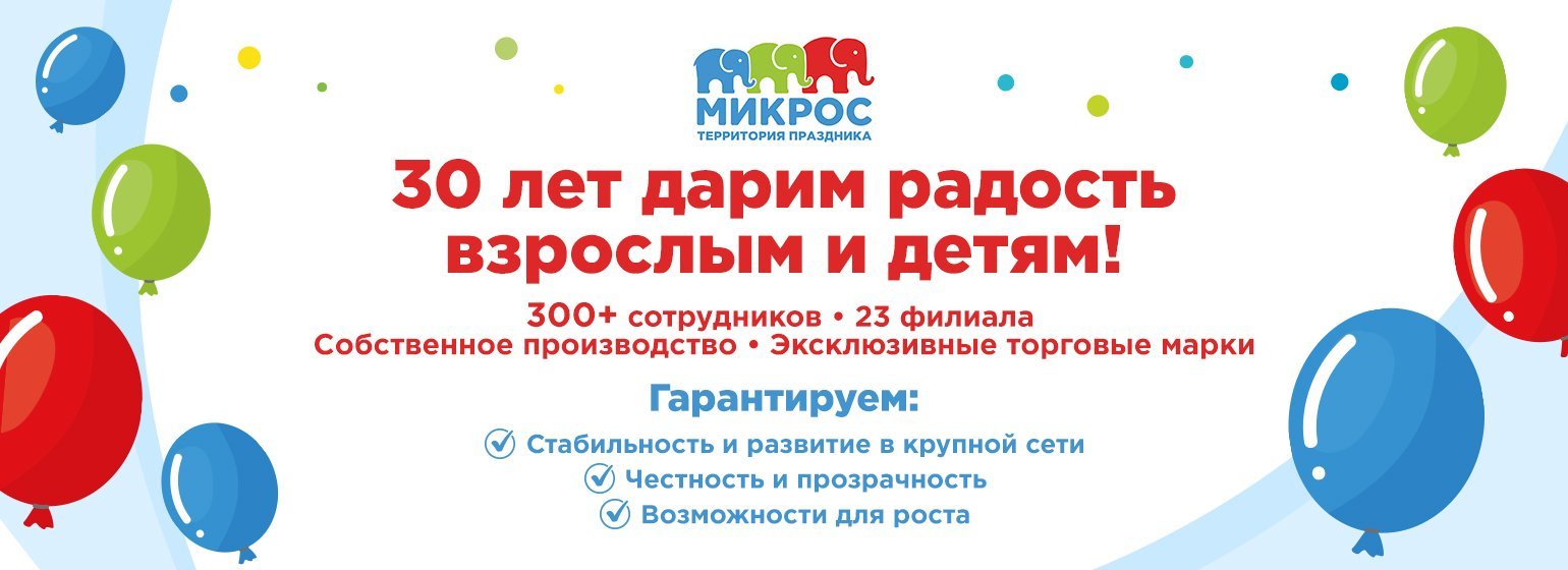 Привет, наш будущий коллега! Приглашаем тебя в МИКРОС - мир творчества, добра и праздника, в команду экспертов в создании незабываемых моментов! Уже 30 лет мы остаемся лидерами в производстве и продаже товаров для праздников. 23 филиала от Смоленска до Хабаровска делают доступными наши продукты для всей необъятной России. С нами из года в год работает более 15 000 клиентов и эта цифра постоянно растет!